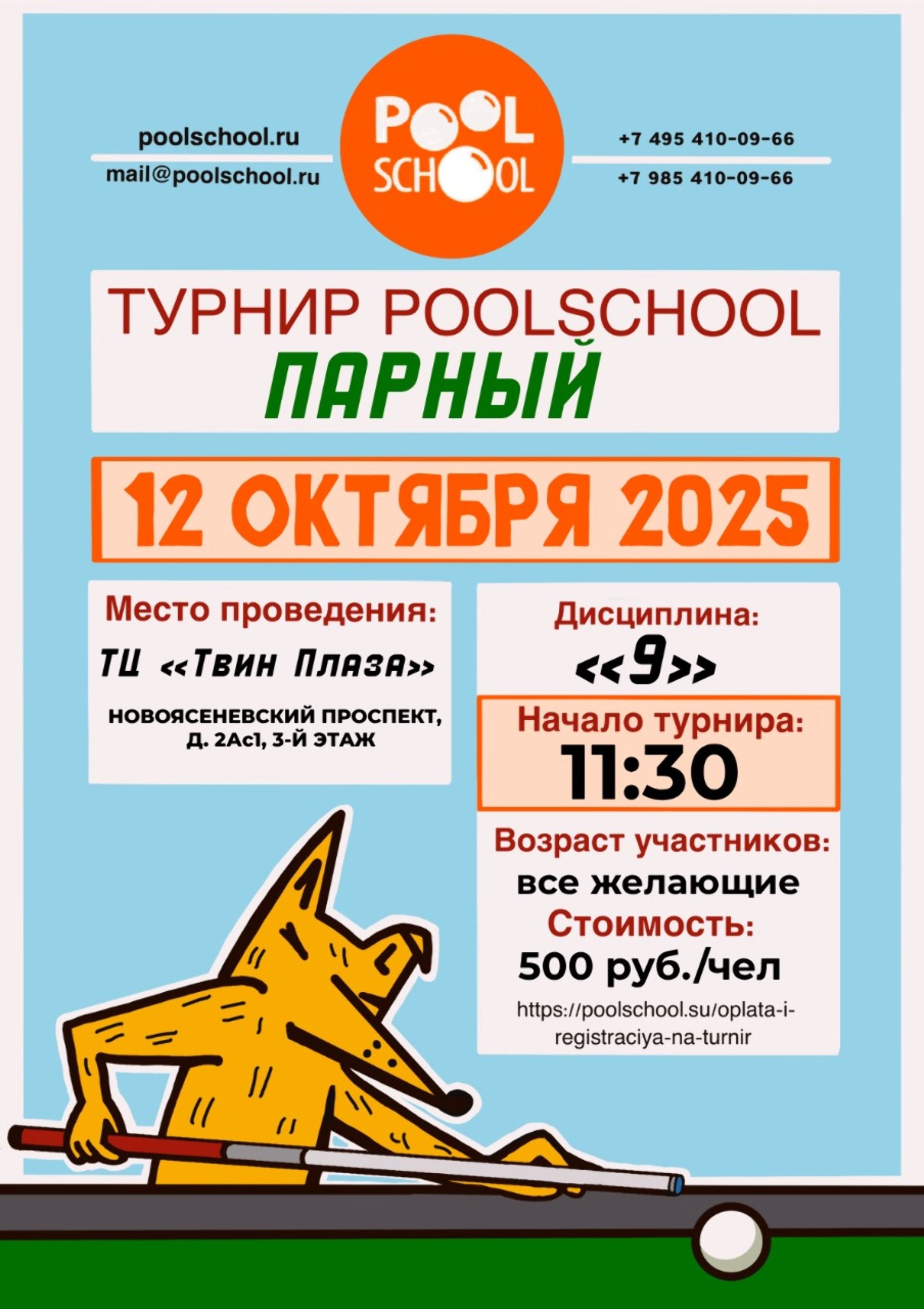 Призовой: 1 место бесплатное участие в любом турнире Poolschool